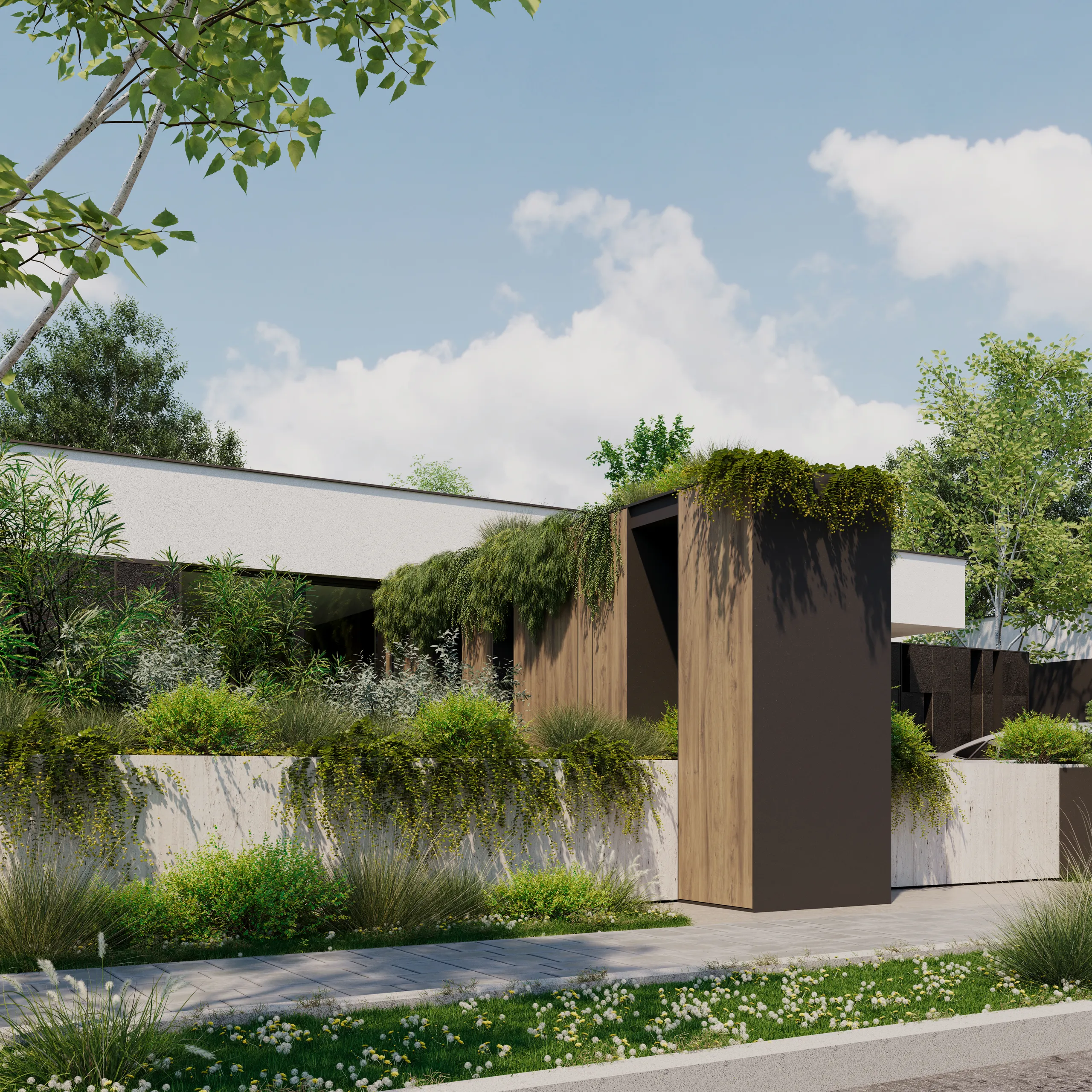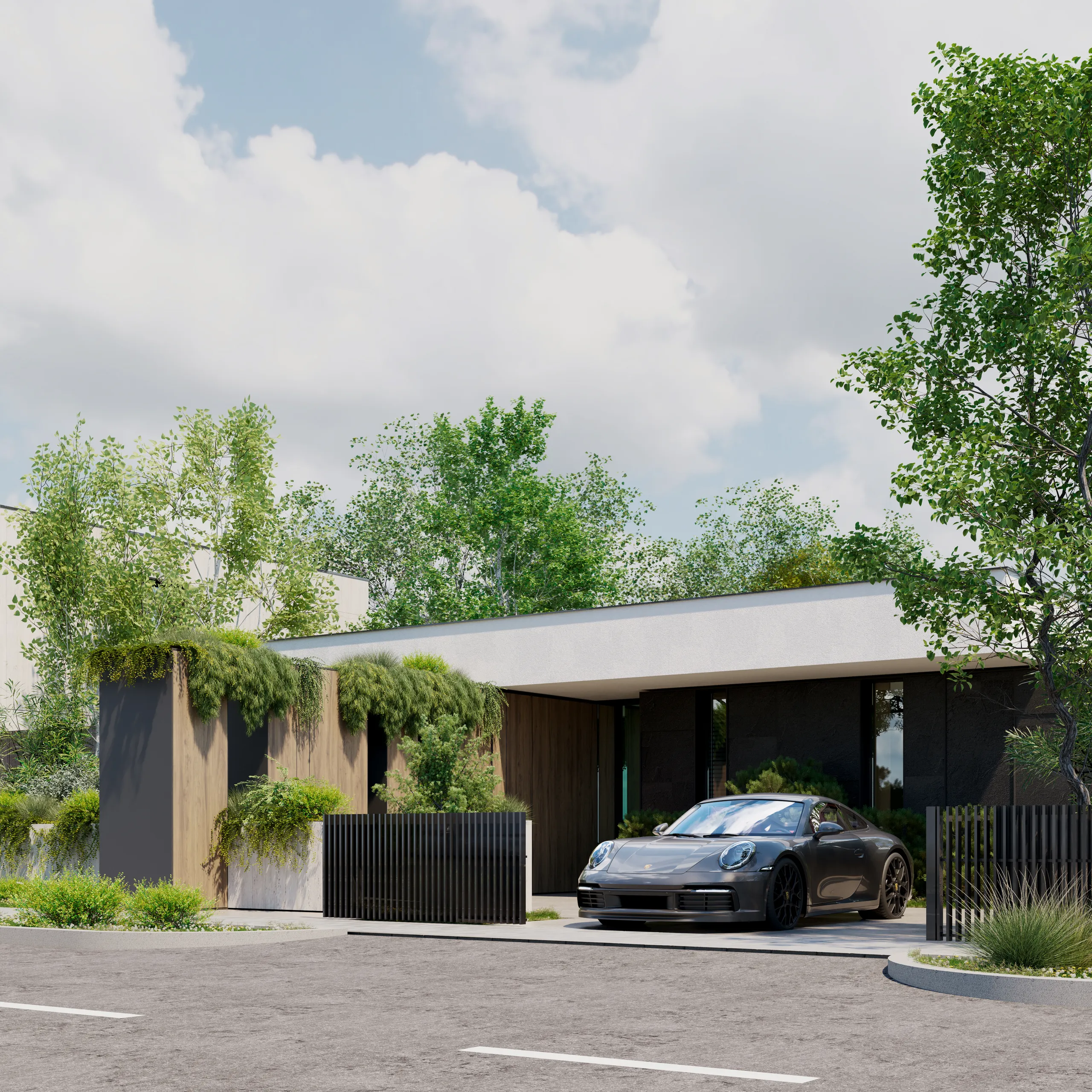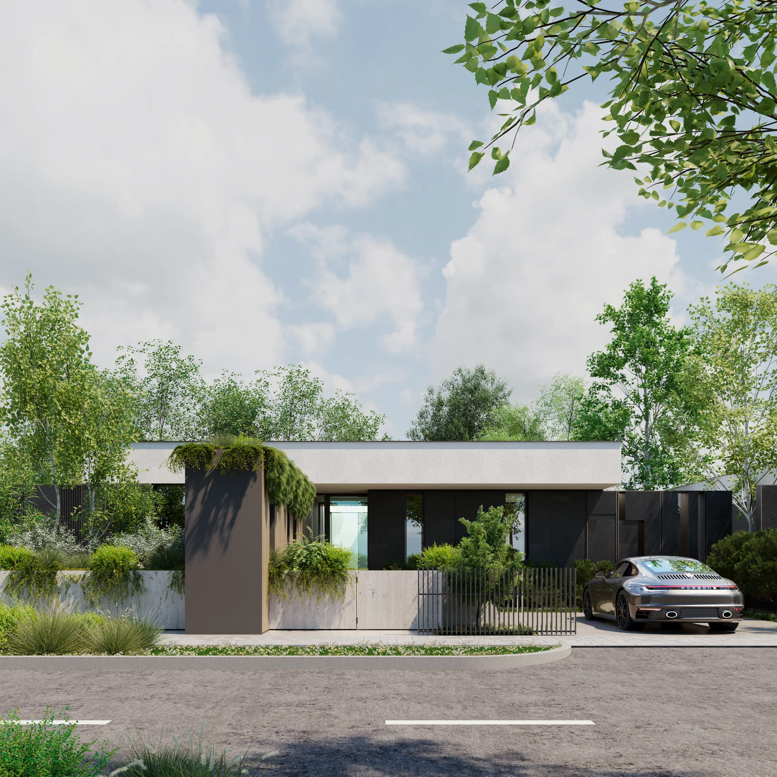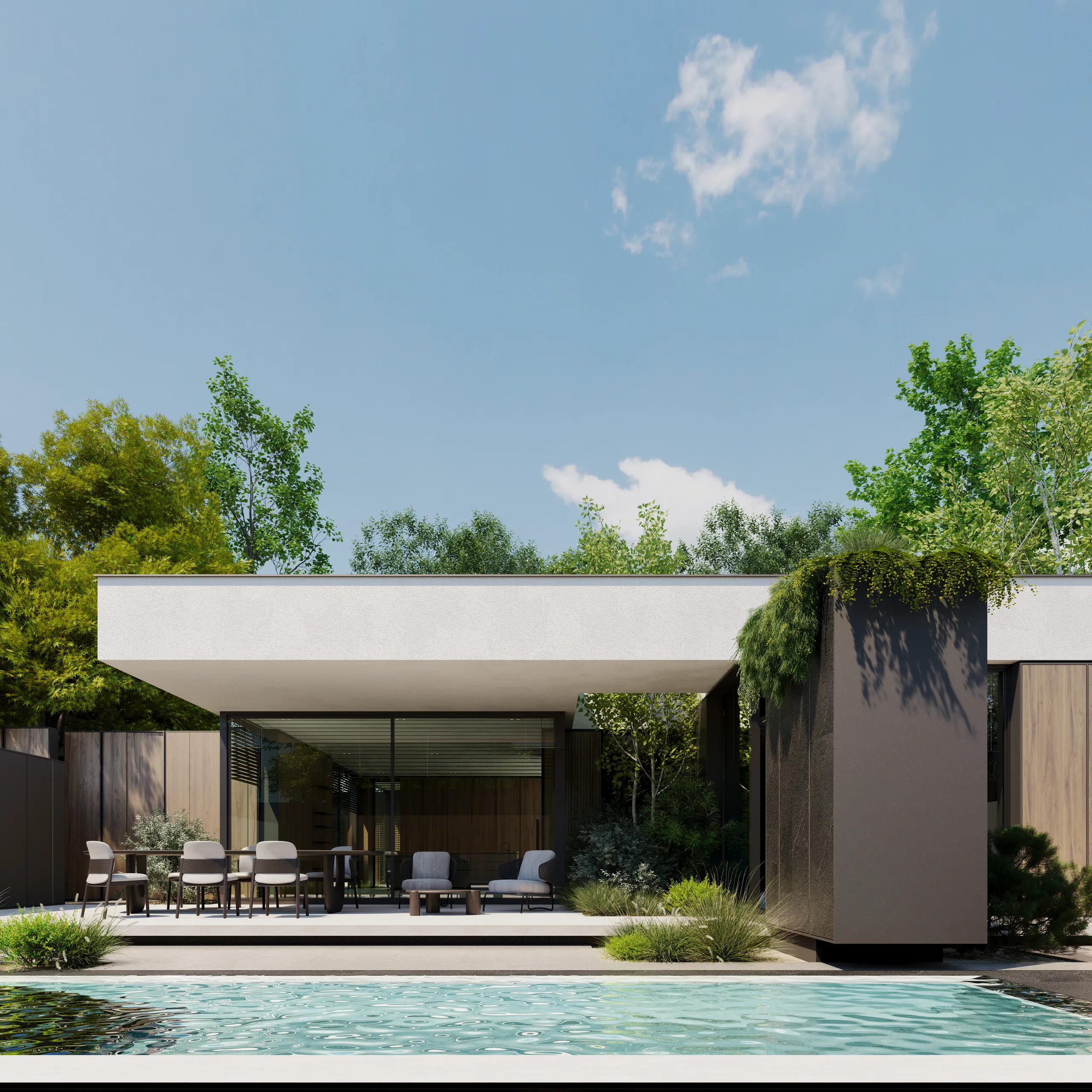 eine einzige linie am horizont. glade erhebt sich nicht zum himmel — es streckt sich in ihn hinein. die vegetation umgibt es, integriert es, verbirgt es fast. reines erdgeschoss, räume, die ineinander fließen, terrassen, die das innere verlängern, ohne anzukündigen, wo das haus endet und der garten beginnt.