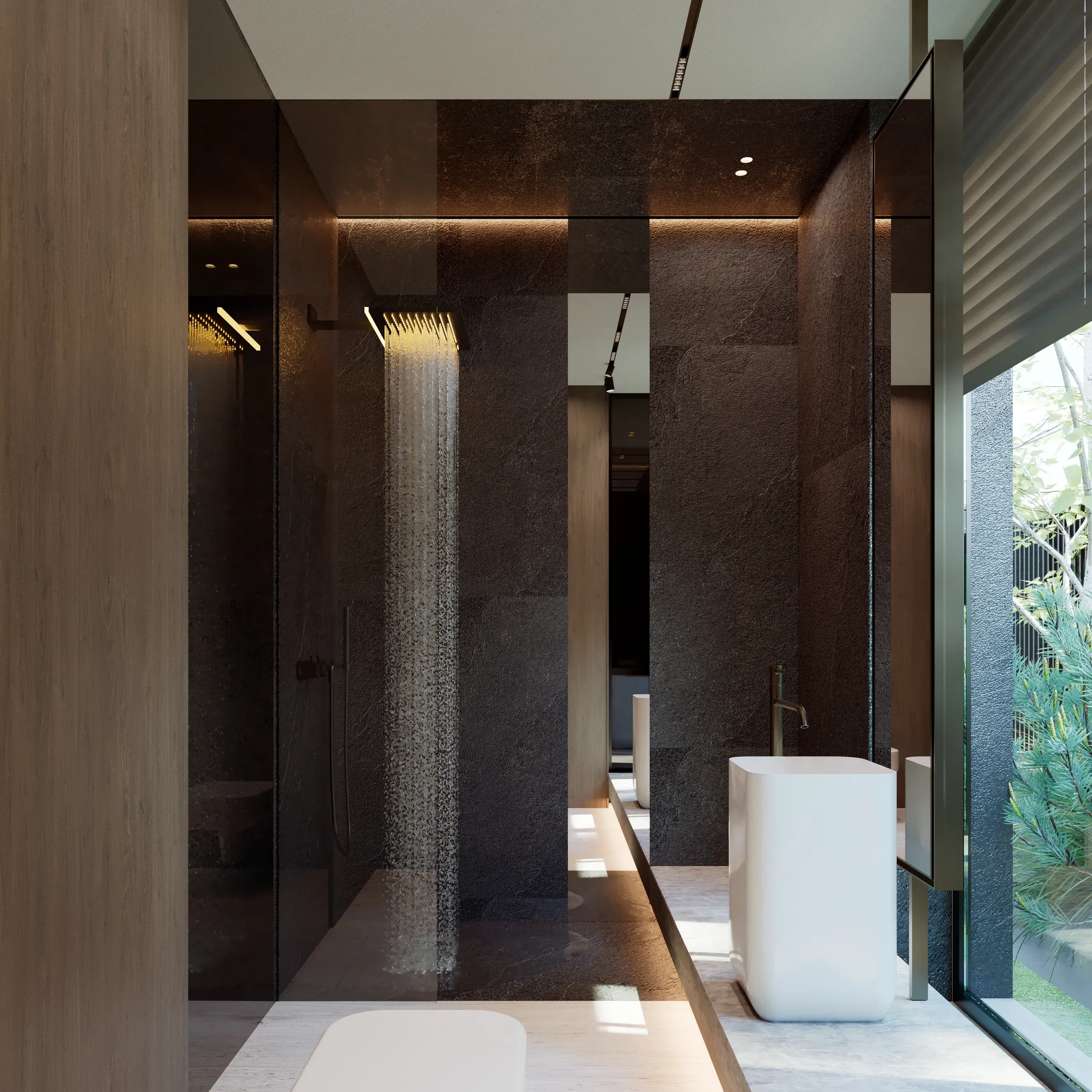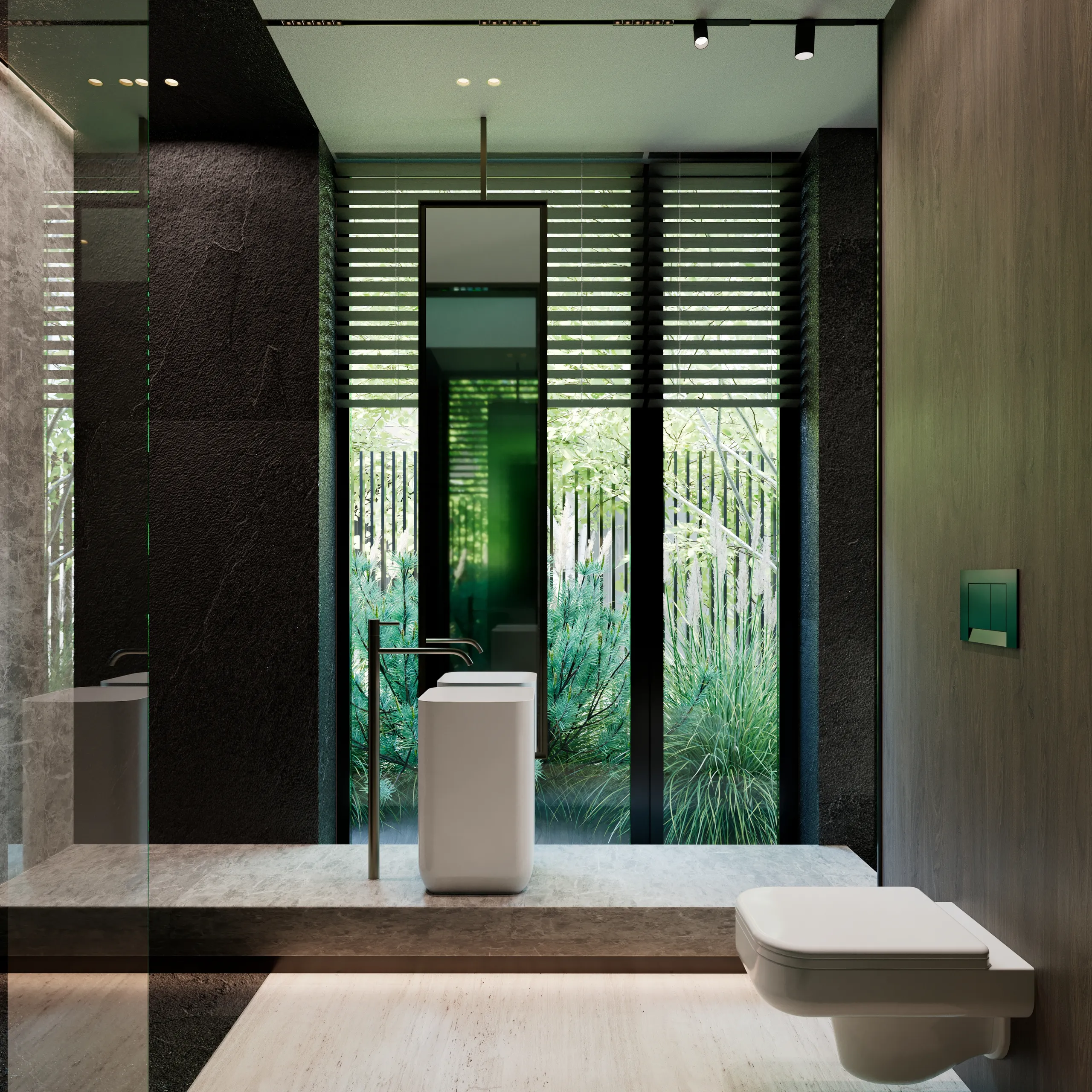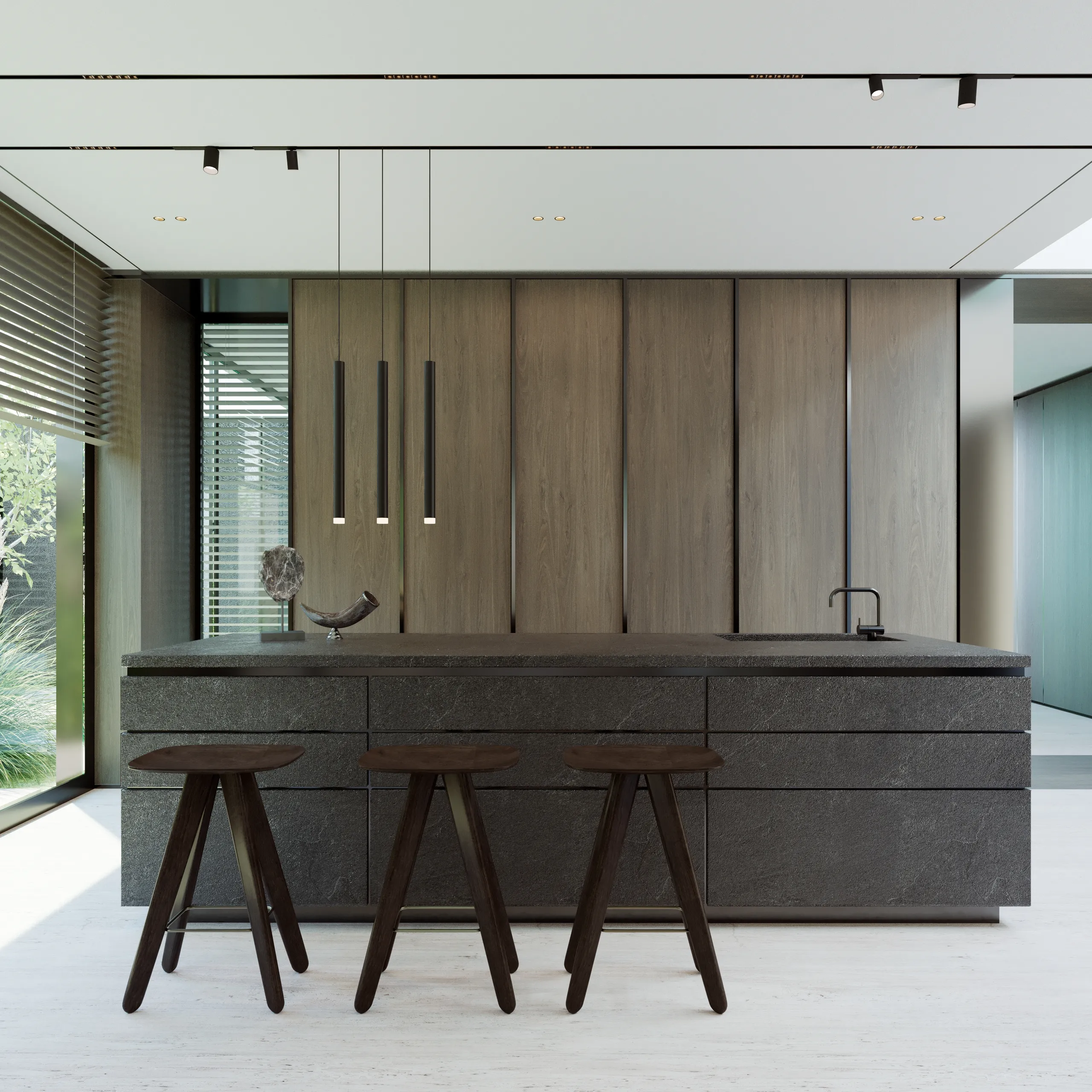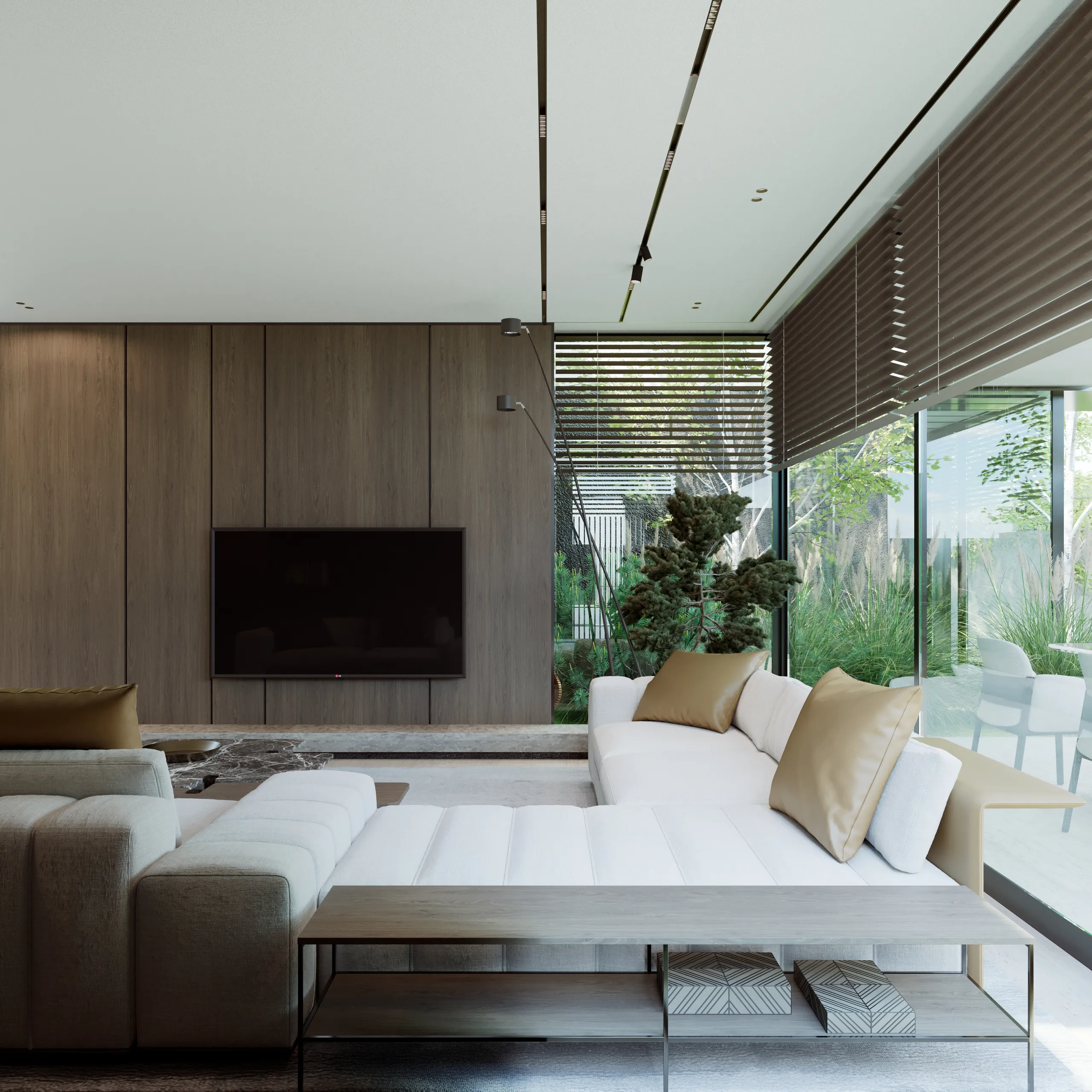 eine einzige linie am horizont. glade erhebt sich nicht zum himmel — es streckt sich in ihn hinein. die vegetation umgibt es, integriert es, verbirgt es fast. reines erdgeschoss, räume, die ineinander fließen, terrassen, die das innere verlängern, ohne anzukündigen, wo das haus endet und der garten beginnt.